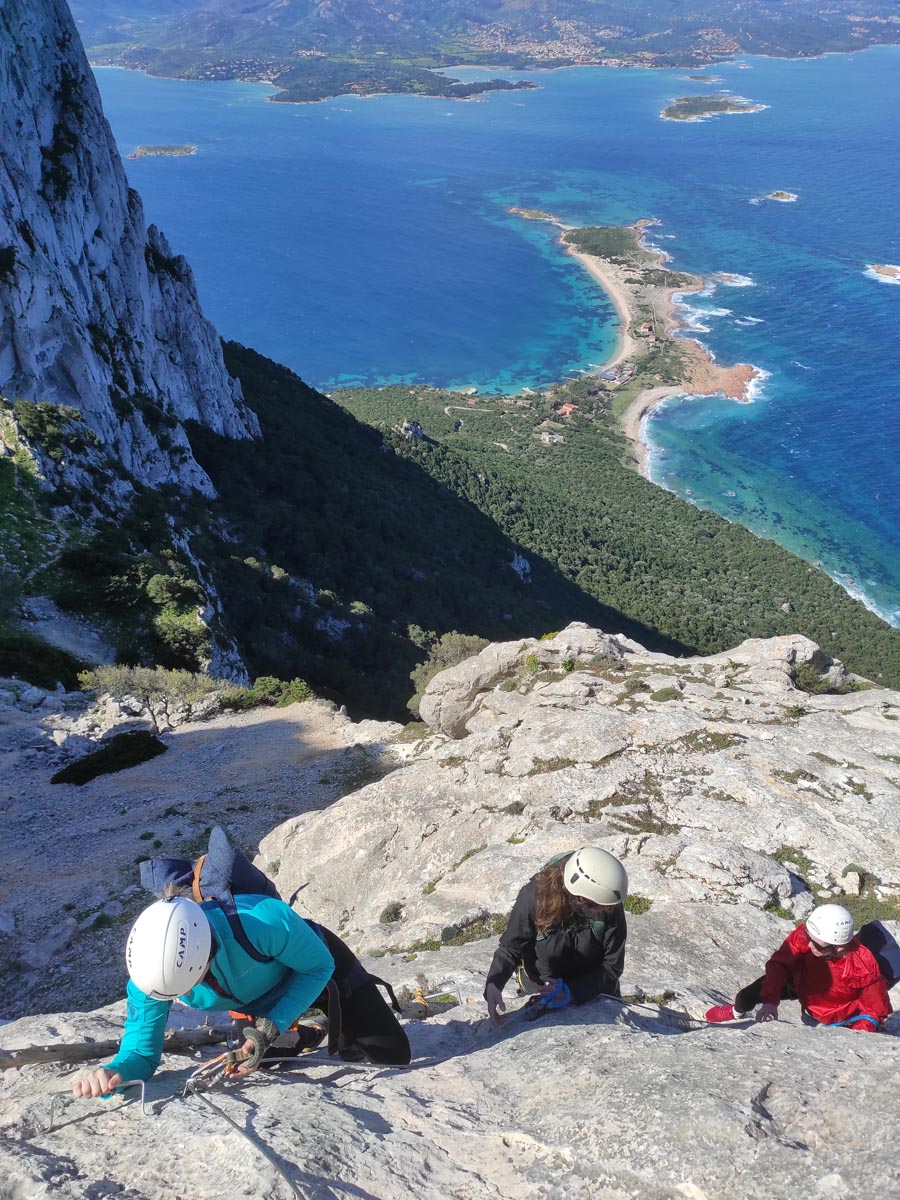 After about one and a half hours of hiking, we reach a place called Pratone. From this incredible natural terrace, you can enjoy breathtaking views over the Gulf of Olbia. Pratone is accessible by following an equipped route known as a Via Ferrata. It is absolutely necessary to have a via ferrata kit, helmet, and harness.
